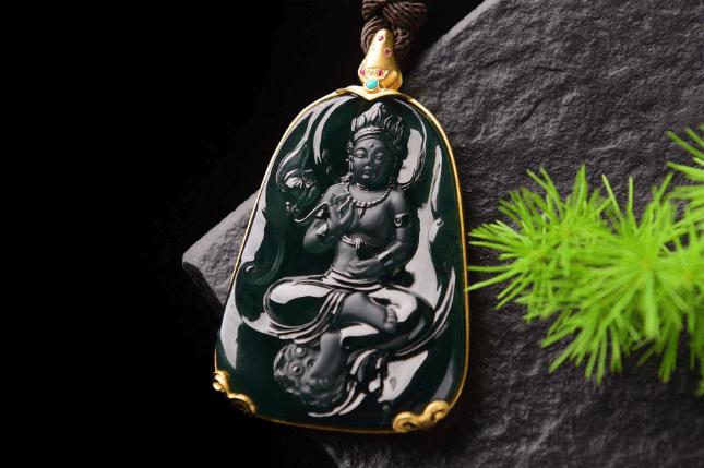 油青种翡翠不同,它的颜色较深,光泽具有很强的油脂性,给人的整体感觉偏暗沉。这种类型的饰品,通常可分细分为两种色调,一种是暗蓝色,它的水头好,我们将其放到灯光下观察时,会发现它呈蓝灰色,不带有绿色调。